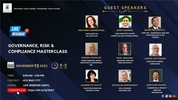 Join us on November 15, 2022 (Tuesday) from 9:00 am to 5:00 pm as industry experts Heather Loewenthal Chair/Director at GRC Institute, Sukh Sandhu (MAITD, MAPEX, MITECA) Chief Executive Officer at Career Calling International, Davis Pulikottil Director – Governance, Risk and Compliance (Vic & Tas) at CyberCX, Damien Schulze a Senior Manager at AGL, Earl Eddings a Managing Director at Riskcom Group, Aaron Guttmann a Director of Market Compliance, Jeannette Scott Solicitor & Principal at Double N Legal, Nicholas Bernhardt CEO & Founder in Informed 365, and Bertram Duerr Commercial & Product Director at Appearition will feature interactive case studies from senior decision-makers in a multitude of industries.
